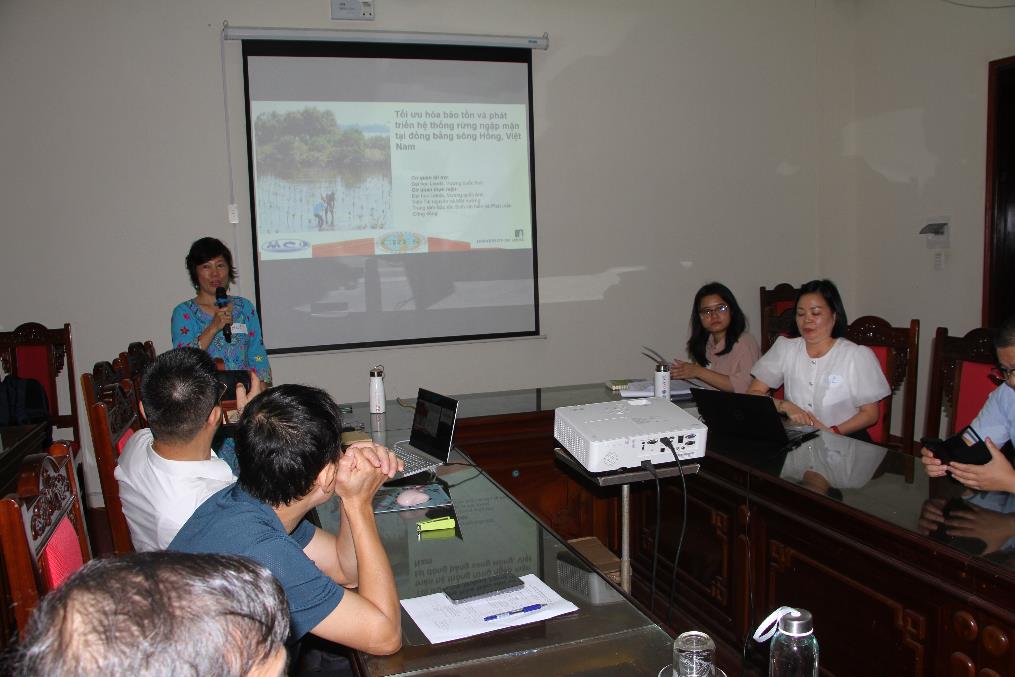 Trong khuôn khổ hội thảo tại hai tỉnh, TS. Lê Thị Vân Huệ đã trình bày báo cáo một số kết quả đã đạt được, đưa ra các giải pháp bảo tồn và phát triển hệ thống rừng ngập mặn bền vững tại địa phương. Kết quả nghiên cứu cho thấy rừng ngập mặn cung cấp các dịch vụ hệ sinh thái quan trọng, hỗ trợ sinh kế và phát triển bền vững cho cộng đồng địa phương. Đồng bằng sông Hồng và hệ thống rừng ngập mặn đã trải qua nhiều thay đổi xã hội và lý sinh. Để giải quyết vấn đề này, quy hoạch cấp tỉnh cần đặt kế hoạch bảo tồn và phát triển bền vững hệ sinh thái rừng ngập mặn. Việc nhận thức các giá trị địa phương về rừng ngập mặn và đưa vào quy hoạch là rất quan trọng. Do vậy, cần trang bị tốt hơn cho cộng đồng sống phụ thuộc vào rừng ngập mặn để họ tham gia quản trị rừng và cải thiện khả năng tiếp cận các lợi ích và lựa chọn sinh kế bền vững. Cần có nguồn vốn tài chính hỗ trợ sinh kế thay thế, ví dụ như Quỹ quay vòng do Hội Phụ nữ quản lý. Đối với các hộ gia đình phụ thuộc vào nuôi trồng thủy sản, phát triển nuôi trồng thủy sản cần góp phần bảo vệ và phục hồi rừng ngập mặn nhằm cải thiện khả năng thích ứng với biến đổi khí hậu. Nhóm nghiên cứu cũng đã đưa ra các khuyến nghị: (1) Trồng và duy trì rừng ngập mặn trẻ thường xuyên để đảm bảo lưu giữ trầm tích ở các khu vực ven biển. (2) Công nhận giá trị địa phương về rừng ngập mặn và đưa vào chính sách của chính phủ để thúc đẩy tính bền vững của hệ thống rừng ngập mặn. (3) Quy hoạch cấp tỉnh cần đề ra kế hoạch bảo tồn và phát triển bền vững các hệ sinh thái rừng ngập mặn quan trọng.