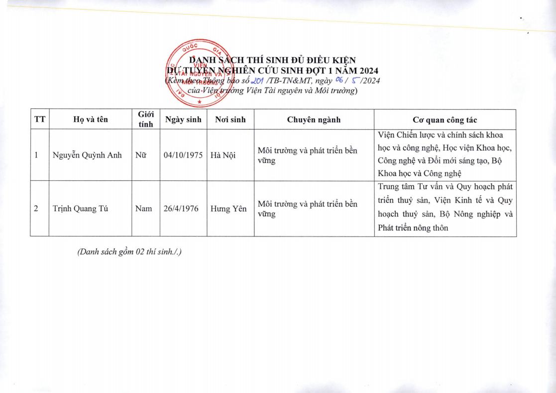 Trang chủ » Tin tức và sự kiện » Thông báo danh sách thí sinh đủ điều kiện dự tuyển Chương trình đào tạo tiến sĩ chuyên ngành Môi trường và phát triển bền vững đợt 1 năm 2024